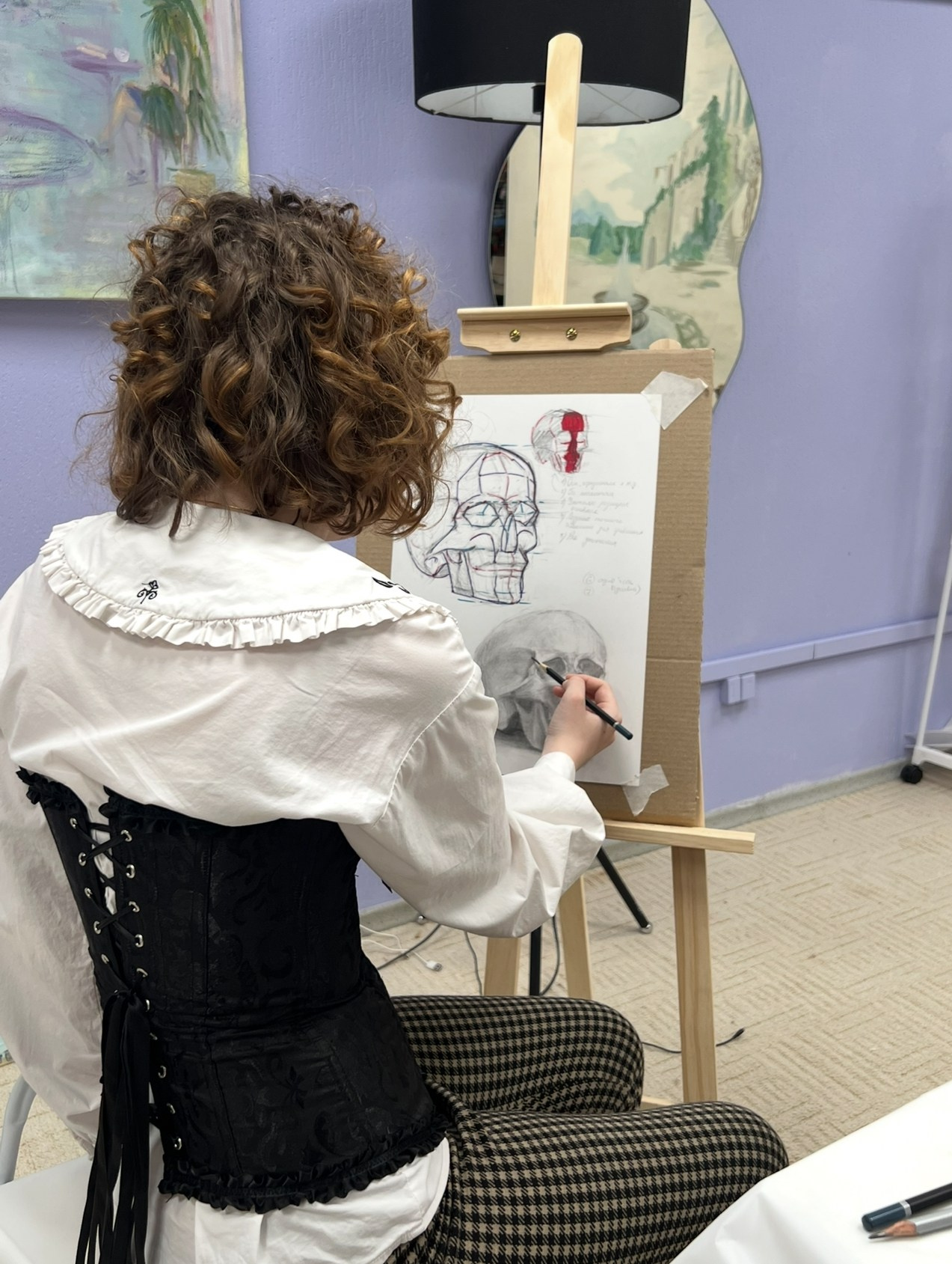 Занятия проходят 3 раза в неделю по 2 часа, на них мы проходим основы академического рисунка, живописи и композиции. В программе — изучение анатомии, перспективы, светотени, работы с натурой и классическими техниками.